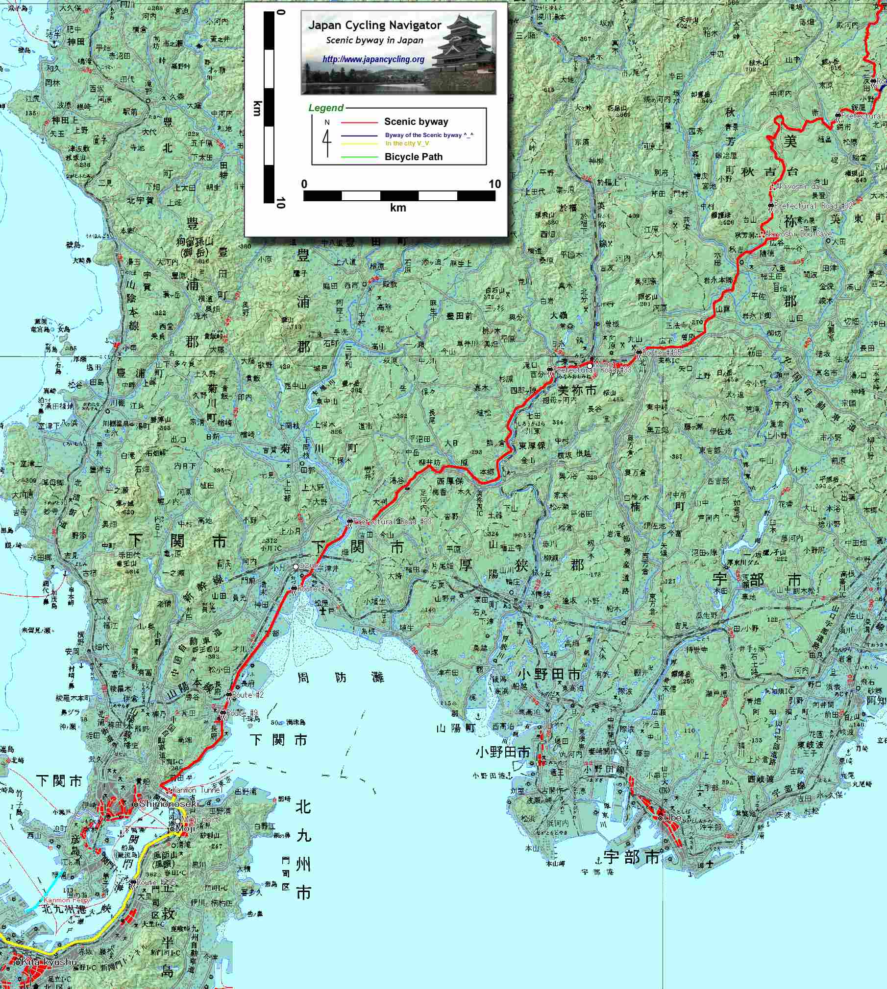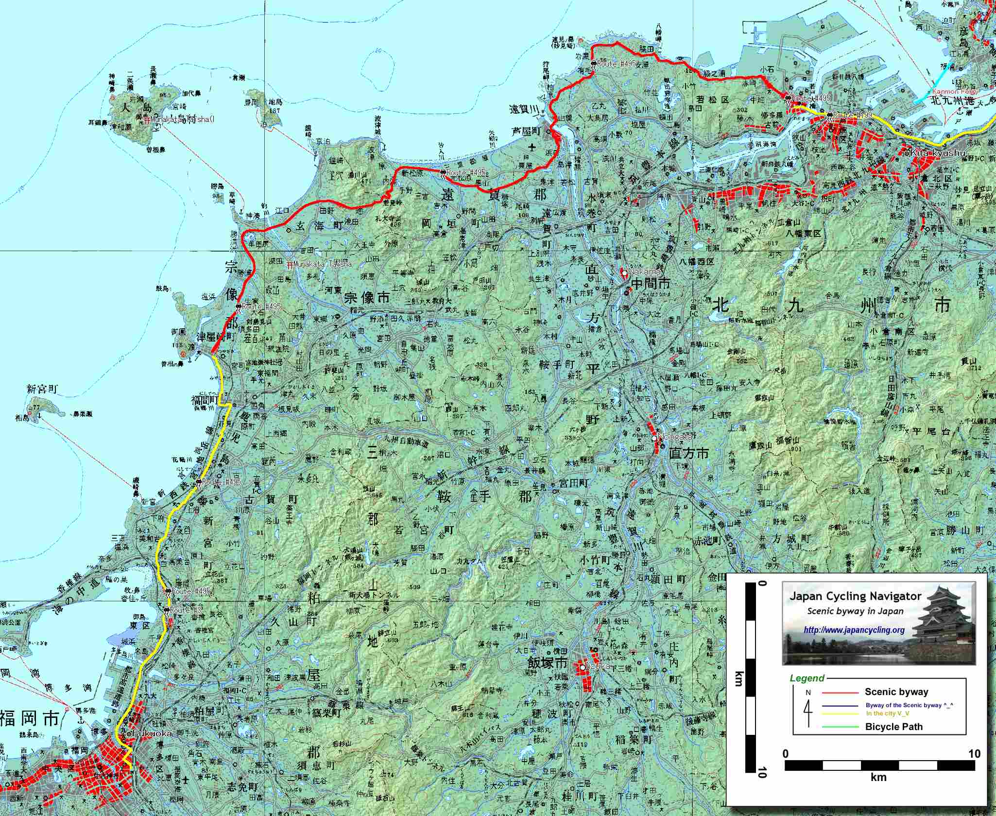 詳細日本の入り口 "福岡"韓国からの海の玄関口となる福岡市は人口130万人の都市であり、北部に位置する人口100万人の北九州市とともに日本第4位の都市圏を構成している。 日本に上陸し、東京方面に向かおうとすると、この巨大な2都市間を恐ろしい交通量と共に走行しなければならない。最短ルートは国道3号を利用することであるが、ここはもう一つ日本海側の道を選びたい。 福岡市の中心から北へ10kmほど走ると、国道3号から国道495号が海側に分岐する。国道3号とそれほど距離は変わらないが、自転車の快適度が勝る国道495号線を選びたい。国道からさらに海岸沿いに入るとさつき松原など日本的な風景にも出会うことができる。 左に海を眺めながら国道495号を走っていると次第に海際にそそり立つ工場群が前方に近づいてくる。これが北九州市である。北九州市は日本で初めて官営製鉄所(西洋式製鉄所)が建設された都市である。ここから本州との連絡口である関門海峡まではその当時からの工場地帯が密集している。主要港であった門司港及び門司港駅周辺では往時(明治、大正時代)の街並みが保存されているので是非覗いてみたい。 門司を抜けたそこは九州最北端。本州に渡るには船を利用するか関門海峡に掘られたトンネルを利用する必要がある。船は、北九州港を横切るように200円で、トンネルは20円で本州に渡ることができる。旅情なら船、経済性ならトンネルをお勧めする。 潮流の激しい「関門海峡」