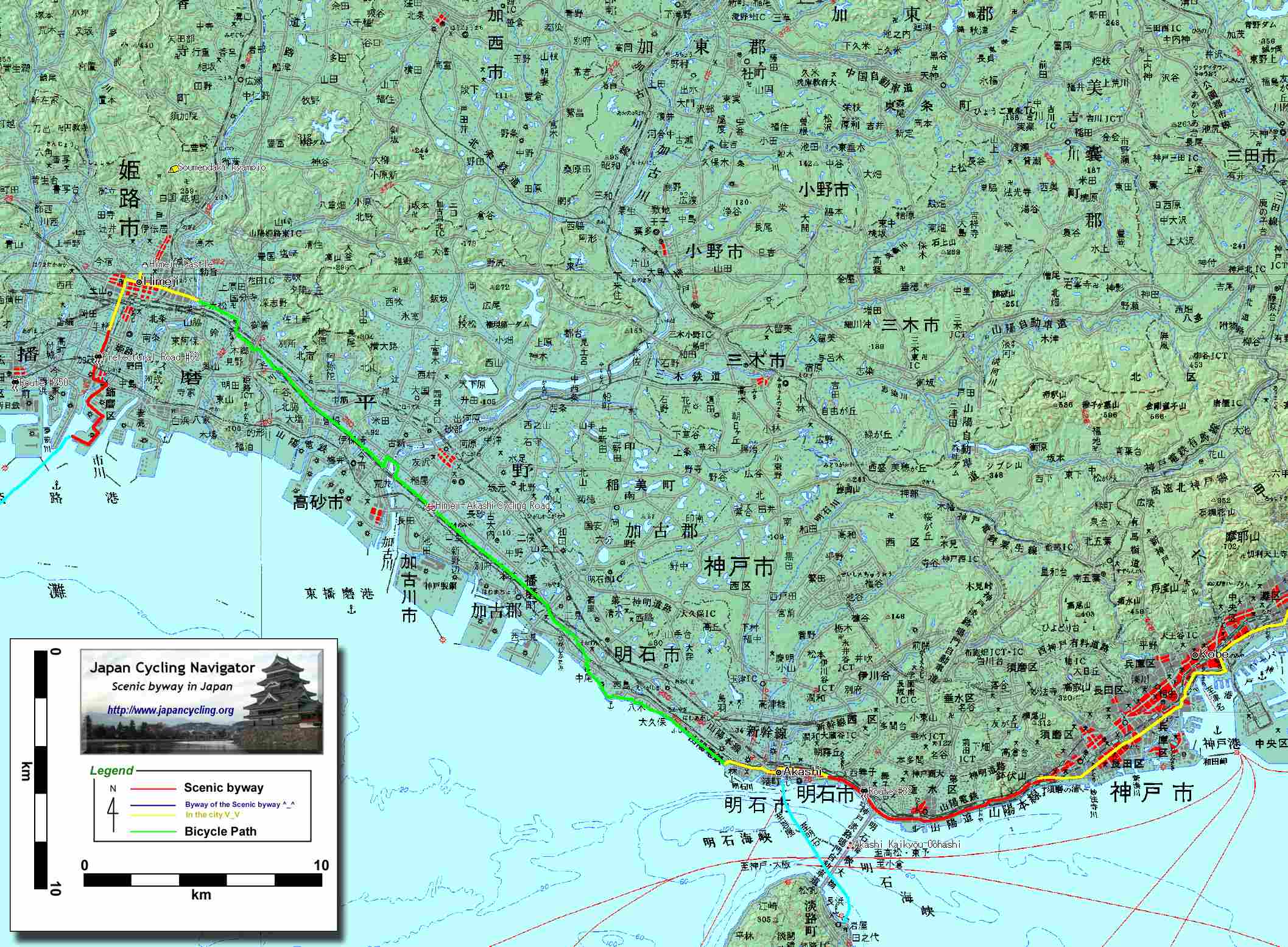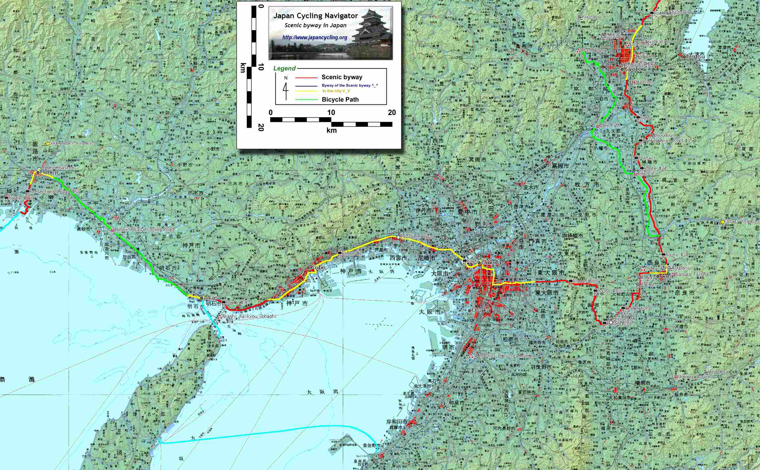 これらの都市を回避しながら東京に向かうルートもあるが、おそらく日本を走る外国人サイクリストで奈良・京都を訪れない人はまれであると思われる。そこでレングス・オブ・ジャパンは、いかにこの交通量の多いエリアを楽しく走るかということに視点を置いて紹介したい。それぞれの都市・施設などの詳しい紹介は既存のガイドブックに譲ることにする。 まず、姫路市を出発したら、姫路〜明石サイクリングロードを使いたい。姫路城から国道2号を2kmくらい走行すると中規模河川の市川を横断する。この市川を渡りきったところから、姫路明石自転車道がスタートする。この自転車道の全長は35km。しばらくは国道2号と臨海工場地帯の間を走行することになるが、明石市に入ると自転車道は海岸沿いに移り、瀬戸内海を間近に眺めながらの自転車だけの海辺空間を走行することができる。 自転車道は明石市の中心に入る手前で終わる。ここ明石市は日本の標準時となっている明石天文科学館がある。この明石市を越えるといよいよ人口1600 万人(大阪府庁舎を中心に半径50km)を超える大阪圏に突入する。 第二の首都「大阪」