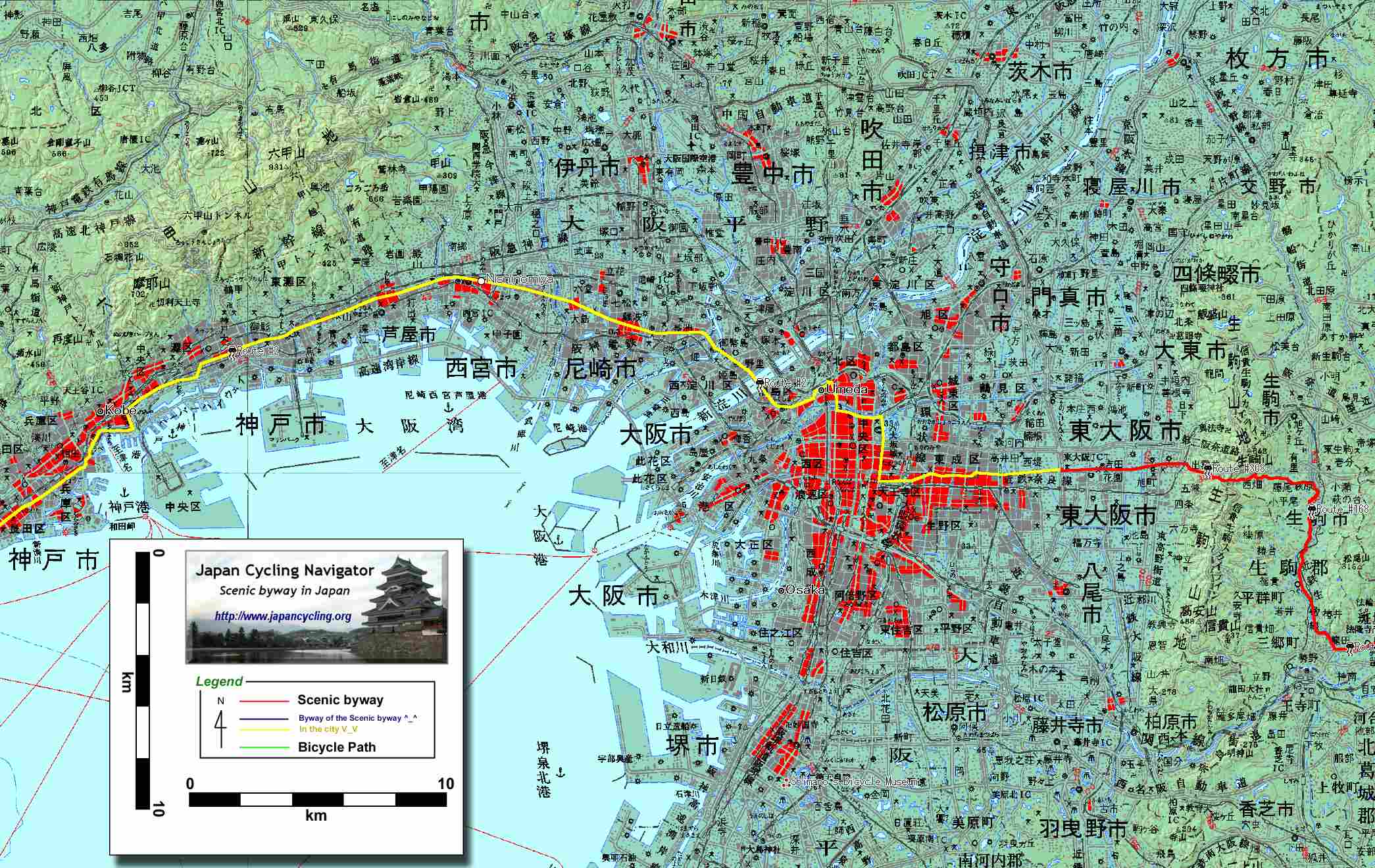 すでに震災から10年以上の月日が流れ、表向きには震災の後は見られない。しかしながら、この歴史ある街に真新しい再開発ビルが林立する都市の姿が、この都市が失ったものの大きさを代弁しているのかもしれない。 震災の際には都市交通は完全に麻痺し、クルマは全く機能しなかった。震災後の市民の足を担ったのはあなたが今またがっている自転車であったのである。人間の生活に一番近い乗り物、最終的に頼りになる乗り物が自転車であることを再認識させたことはいうまでもない。 しかしながら、決して自転車にやさしい街とはいえない。この神戸から大阪にかけては、自動車の大気汚染が原因で訴訟が起きたほど、自転車走行には劣悪なエリアである。 この神戸から大阪を抜けるまでは、「この異常な交通量が日本だ」と理解してもらい走行してもらうしかない。