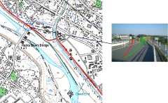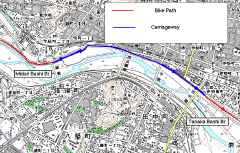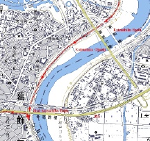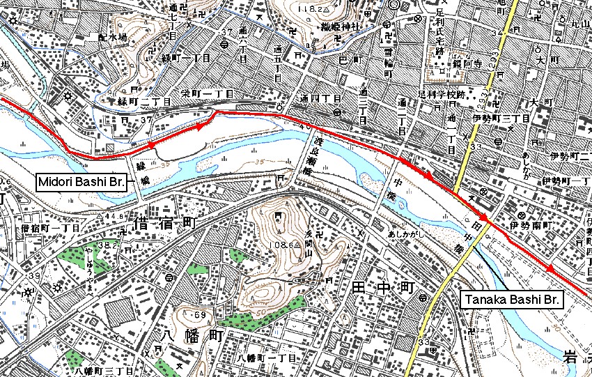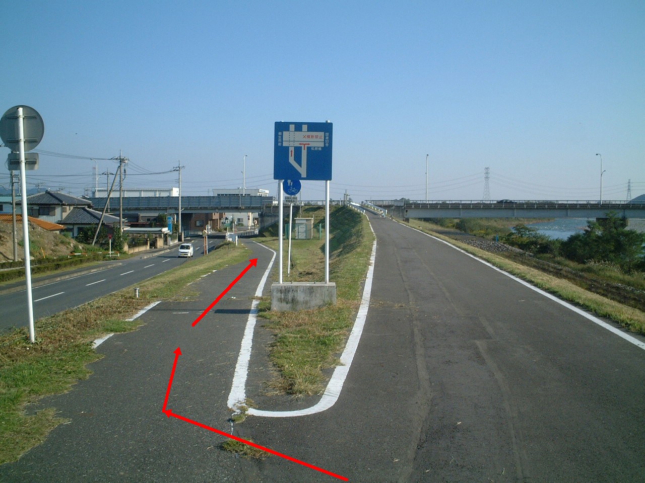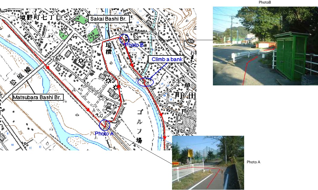 桐生市の次の大きな都市は足利市である。松原橋から600mほど走ると足利市との境に着く。サイクリングロードは大きく左へ曲がり少し戻る格好になる。わかりにくいポイントなので左の写真、そして以下の地図などを参照して欲しい。
