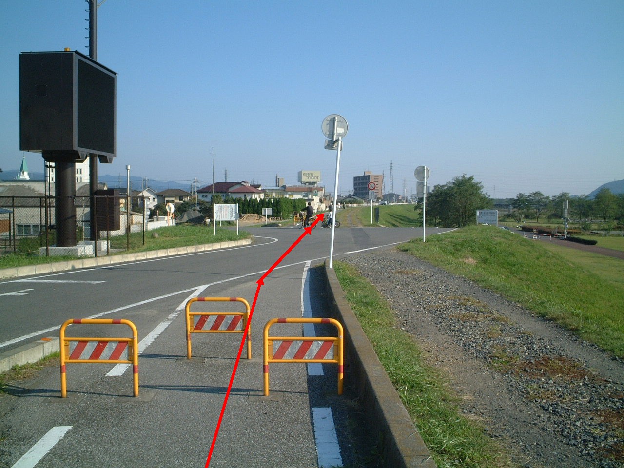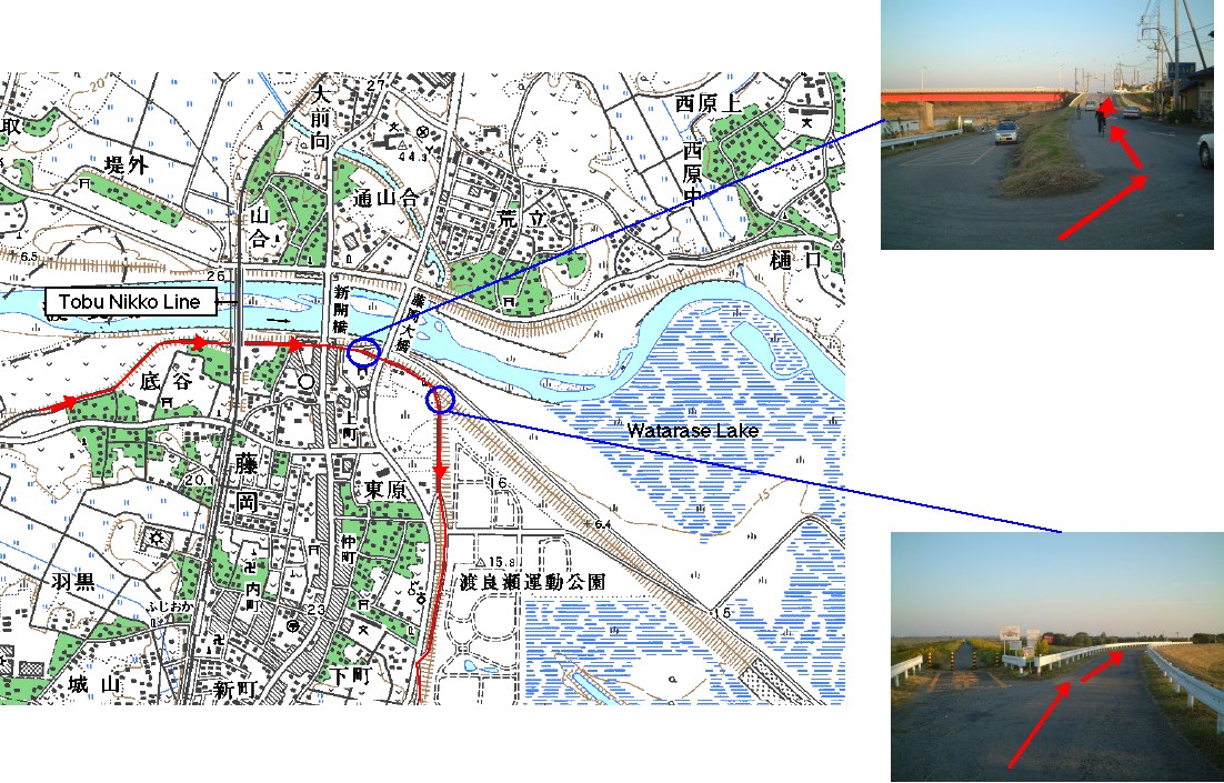 ここから渡良瀬川沿いのサイクリングロードに出るが、残念ながらサイクリングロードは何度と無くわかりにくい場所がある。ここではそれをできる限り解説する。いずれにしてもサイクリングロードをつないで走るには十分価値があるのであきらめずがんばって欲しい。私たちも標識の整備などを訴えていきたい。