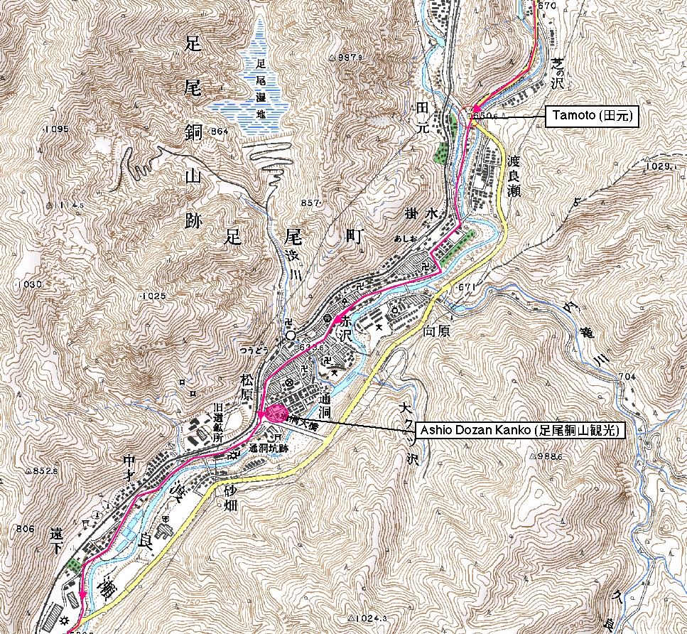 足尾市「田元」についたら右の旧道を走ろう。 なお、国道122号沿いは大間々まで何度も旧道や対岸の道を走れる機会がある。面倒がらずに交通量の少ない道を選びながら走って欲しい。 さて最盛期には人口4万人を擁した足尾の街であるが、そんな銅山も1970年代にはその役目を負え、現在はひっそりとした観光地となっている。足尾市街には当時の坑道をそのまま利用した博物館があるのでぜひ訪れてほしい。トロッコ列車に乗ることもできる。 足尾の谷を流れる川は渡良瀬川という。この谷を源流とするこの渡良瀬川は巨大都市東京の水源の1つとして今日も大きな役割を果たしている。川沿いに谷を下ると巨大なダムが現れるが、それがその証拠である。この草木ダムは関東圏の重要な水供給地なのである。