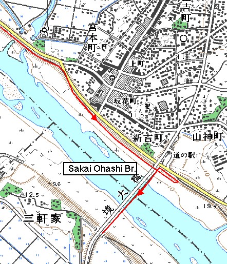 残念ながらこの橋には素直に入ることはできない。まず橋をくぐってから左に曲がり、土手を戻る手順が必要だ。すると自転車と歩行者専用橋に着く。 橋を渡ったら2km近く車道を走ると関宿橋が見えてくる。