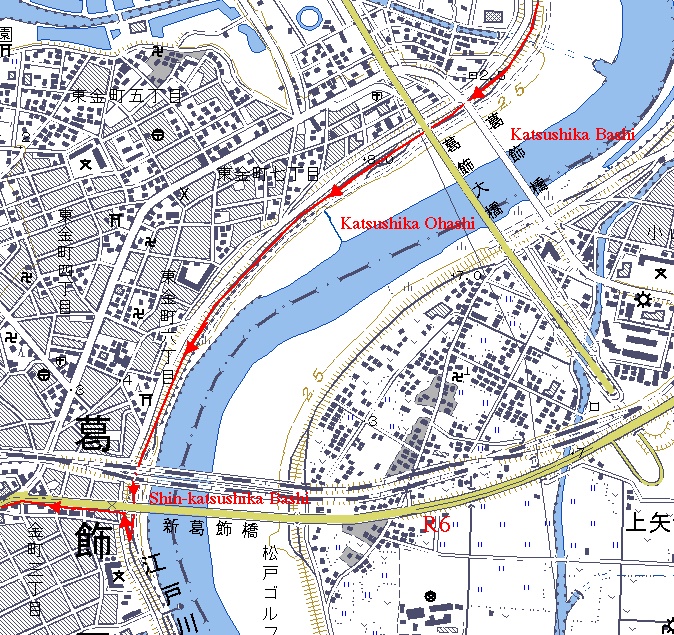 東京中心へ行くには「新葛飾橋」から国道6号を通るのが便利だ。なお、ここでも境大橋と同じような手順が必要だ。つまり、一度橋をくぐってから戻るようにして道路に出る。