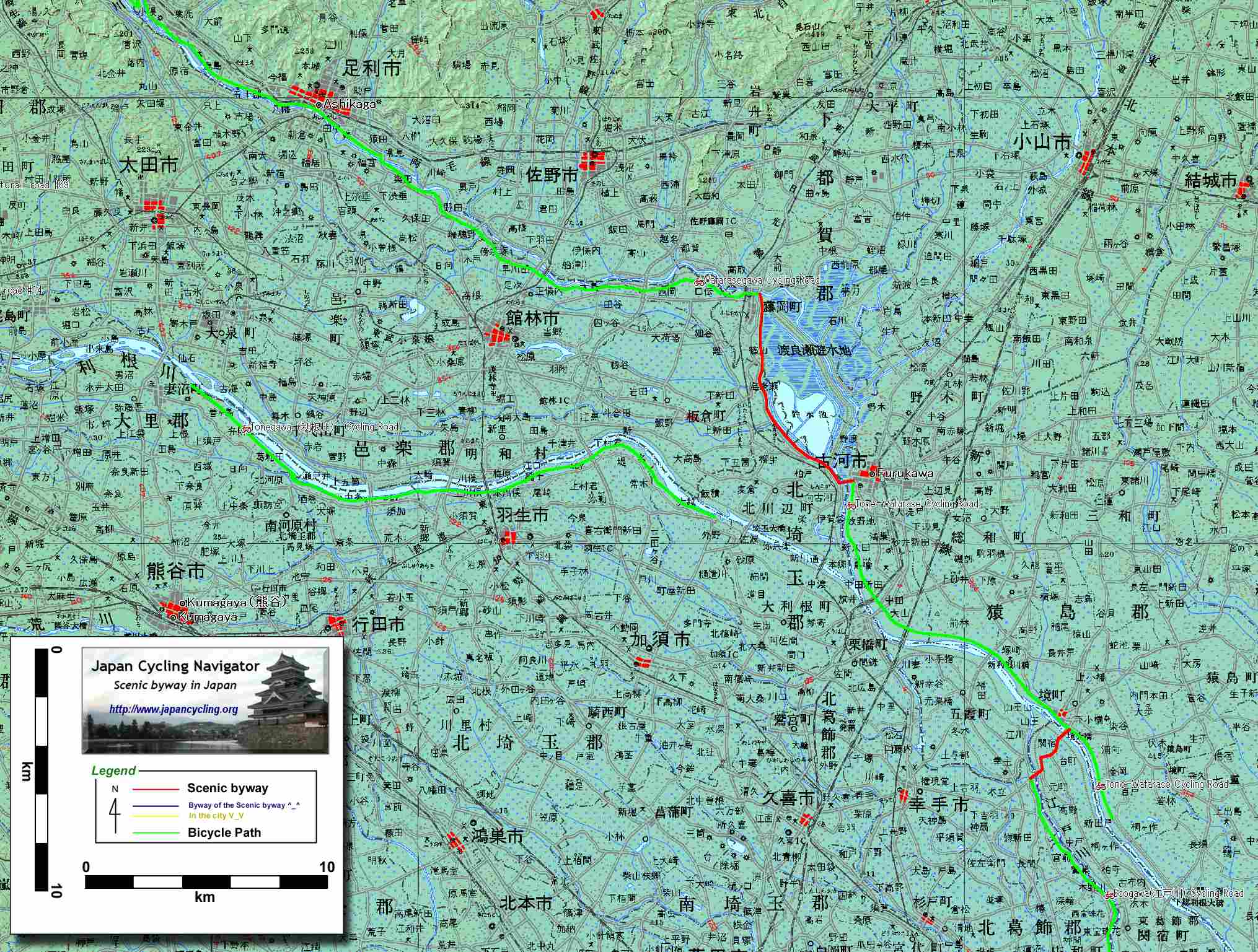 この自転車道は一応、東京までつながっているが、その道のりは河川の両岸を使いながら、複雑に入り組んでいる。日本人サイクリストでも看板や正規のルートを発見できずにコースアウトしやすい。日本に自転車ルートの組織化が求められていることを実感させられるルートでもある。 桐生市