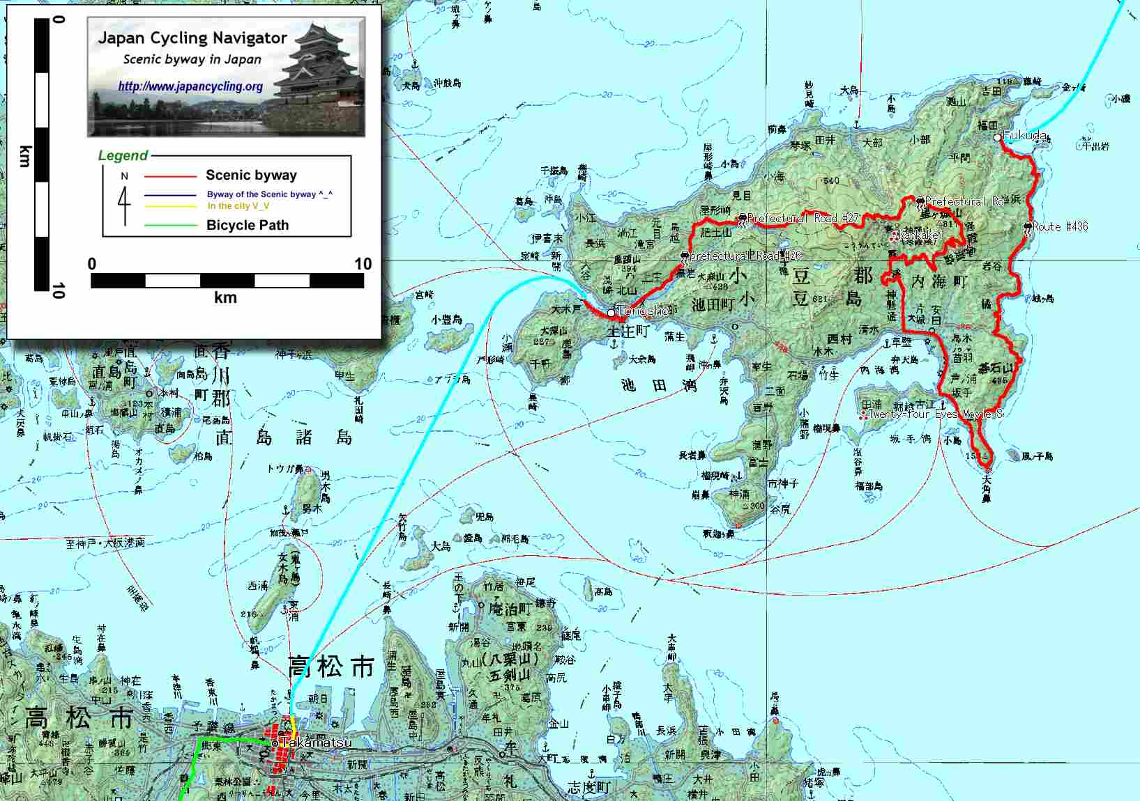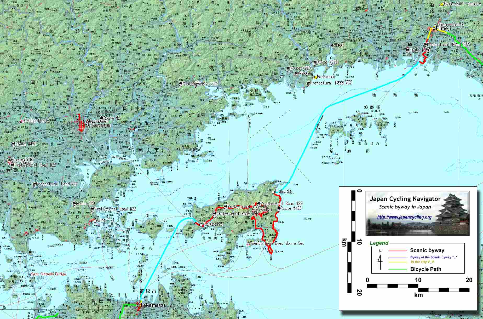 もしこの航路を選択したら、本州への船旅の最中に甲板に出てみよう。西には、瀬戸大橋が望める。瀬戸大橋は、本州四国連絡橋としては最初の橋であり、1988 年に開通した。瀬戸大橋は、6つの橋と4つの高架橋の総称であり、総延長13.1kmは道路鉄道併用橋では世界最長を誇っている。宇野港から県道45 号線を北上すると、中国地方有数の都市・岡山に到着する。 しかし、今回のレングス・オブ・ジャパンでは、この瀬戸内海を堪能する航路をうまくつかった旅を提案したい。高松からは、瀬戸内海に浮かぶ小豆島の土庄に渡ろう。自転車込みで760円である。 小豆島はオリーブと渓谷、そして二十四の瞳で有名だ。 土庄港からの丘、見渡す限りにオリーブの木々を見ることができるだろう。島の気候は地中海性なのである。
